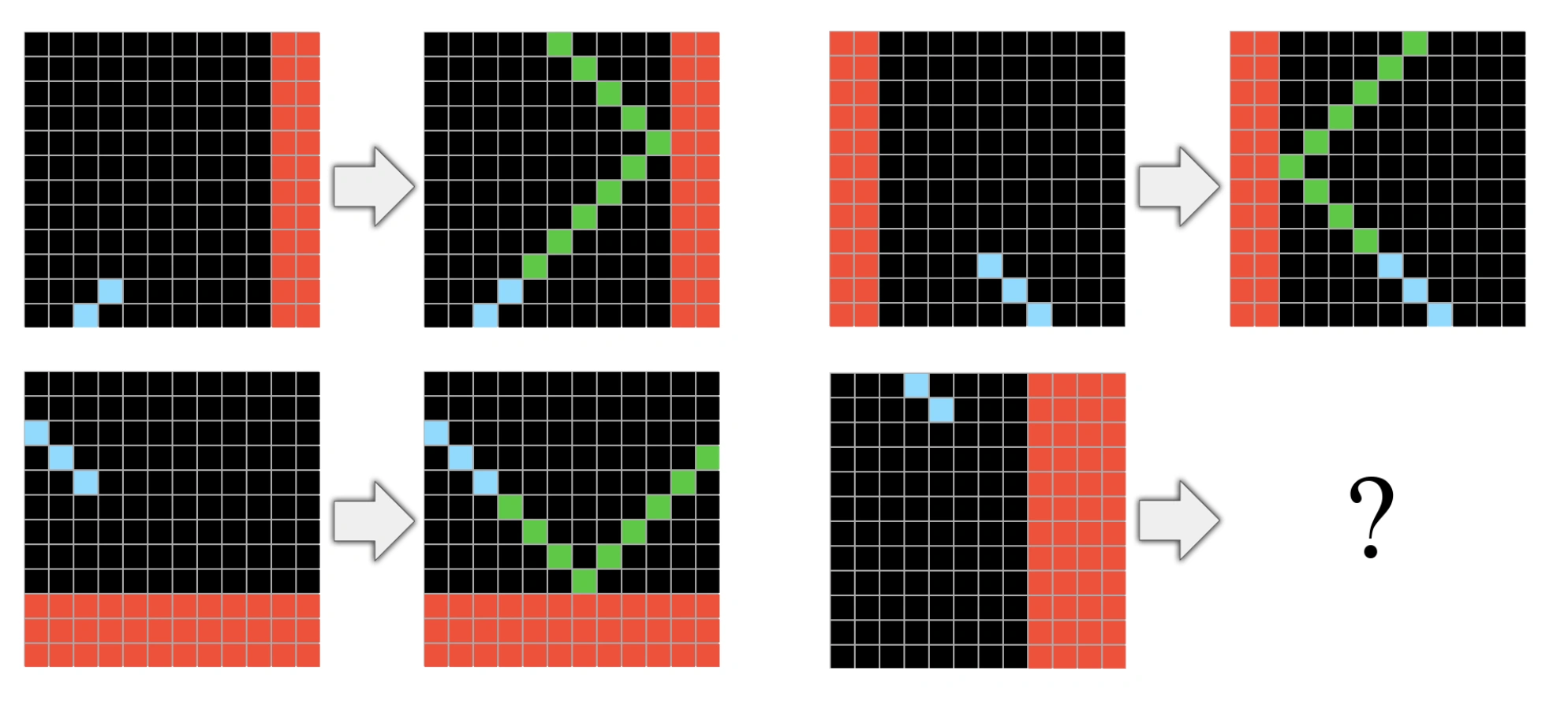 この原則については、LLMの抽象化と推論能力を評価するためのAbstraction and Reasoning Corpus(ARC)が例に用いられました。ARCは、オブジェクト性、単純な幾何学と位相、基本的な数といった「コア知識」に基づいて手動で作成された1,000のタスクが含まれています。例えば、以下のようなタスクです。