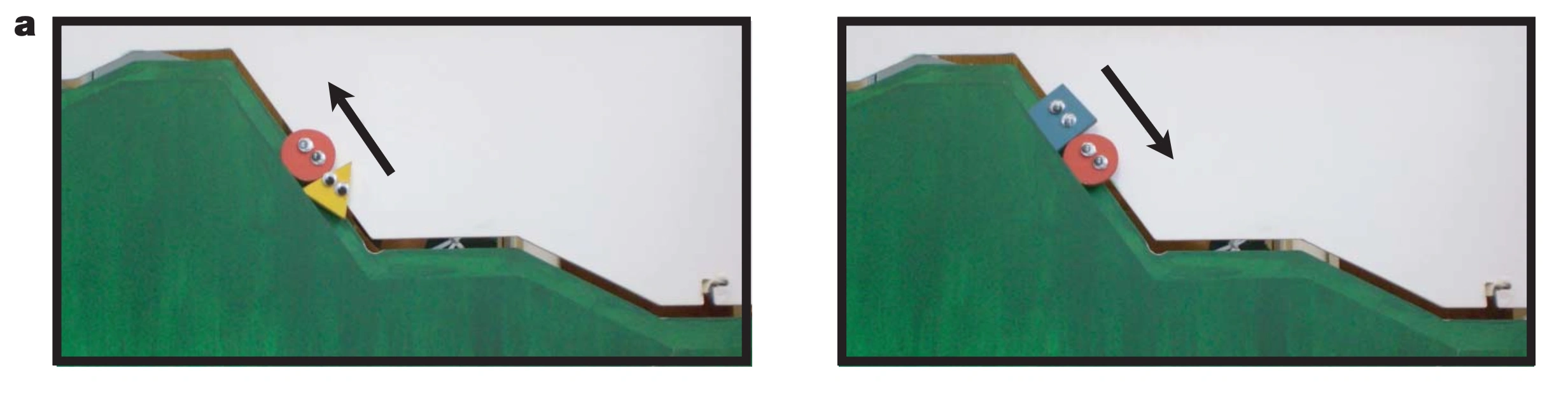 観察された行動を生み出しうる代替戦略(暗記やショートカット)を考慮し、それらに対する統制を設計すべきです。これについては、乳児の道徳的な推論に関する論文「Social evaluation by preverbal infants (2007)」から非常にユニークな事例が紹介されました。この研究では、生後6〜10ヶ月の乳児に以下に示す2種類のアニメーション動画を見せます。左側がHelperシナリオで、赤い丸のキャラクターが坂を登ろうとするのを黄色い三角のキャラクターが後ろから押して助け、無事に坂を登りきります。一方、右側がHindererシナリオで、赤い丸のキャラクターが坂を登ろうとするのを青い四角のキャラクターが上から押し戻して邪魔をし、坂を登れません。この2種類の動画を見せた後、乳児にどちらのキャラクターがより好きかを選んでもらいます。