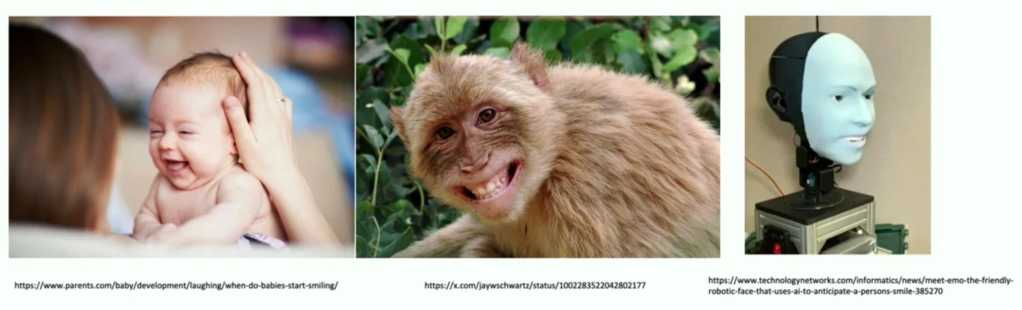 講演中では例として、赤ちゃんが笑ったとき、人間は喜んでいると解釈するが、猿は恐怖やストレスを感じたときに笑ったような表情(Fear grimaceと呼ばれる)を示すことが挙げられました。それでは、AIが組み込まれたロボットが笑ったときはどう解釈すべきでしょうか。この例は、AIが人間と同じように感じたり考えたりしていると安易に思い込まないよう注意を促しています。