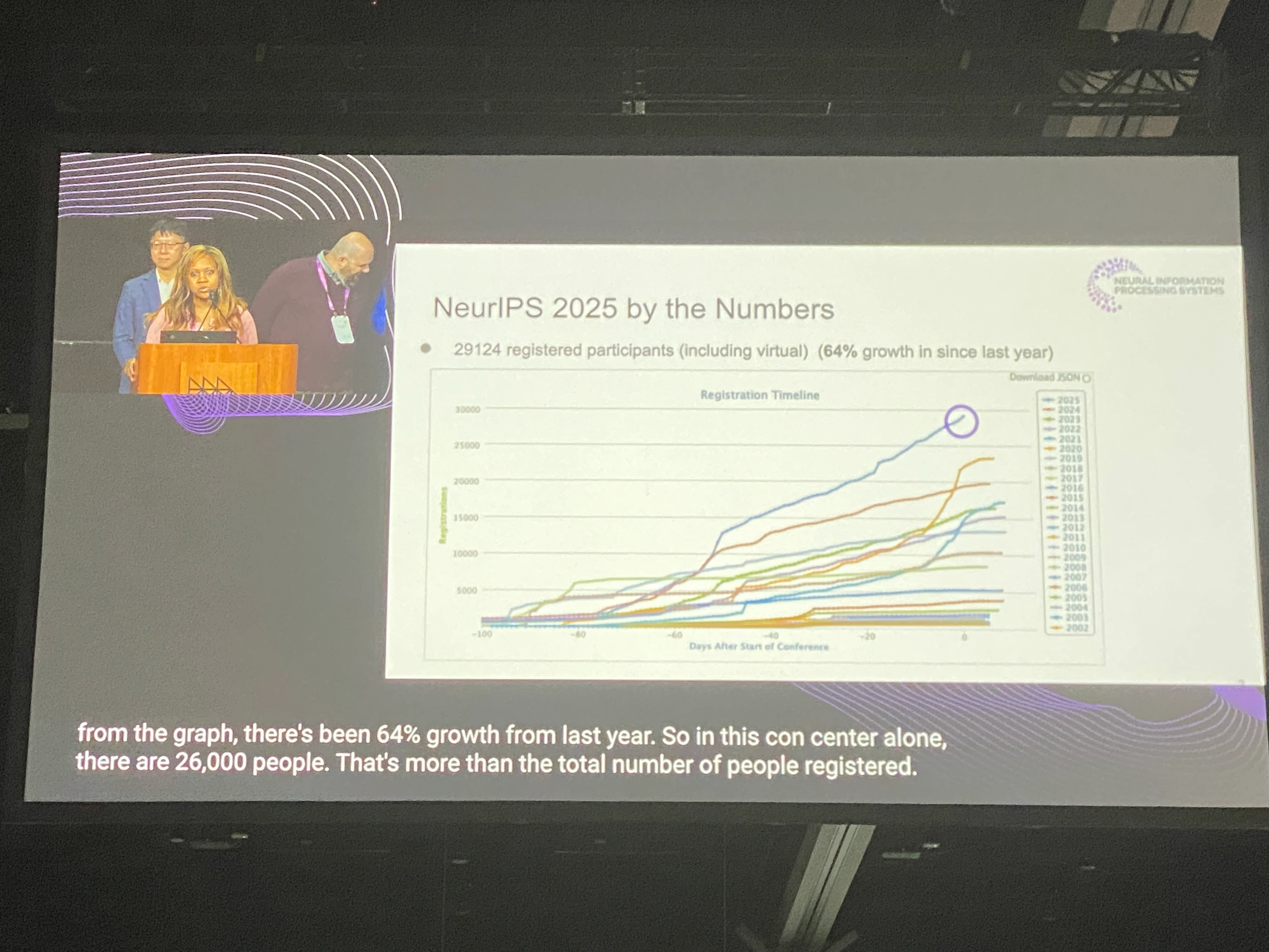会場となったSan Diego Convention Centerには世界中から研究者が集まり、Opening Remarksで発表された数字によると、バーチャル参加者を含めた参加者総数は29,124名にのぼりました。また、Main Trackへの今年の論文投稿数は21,575件、採択率は24.52%でした。